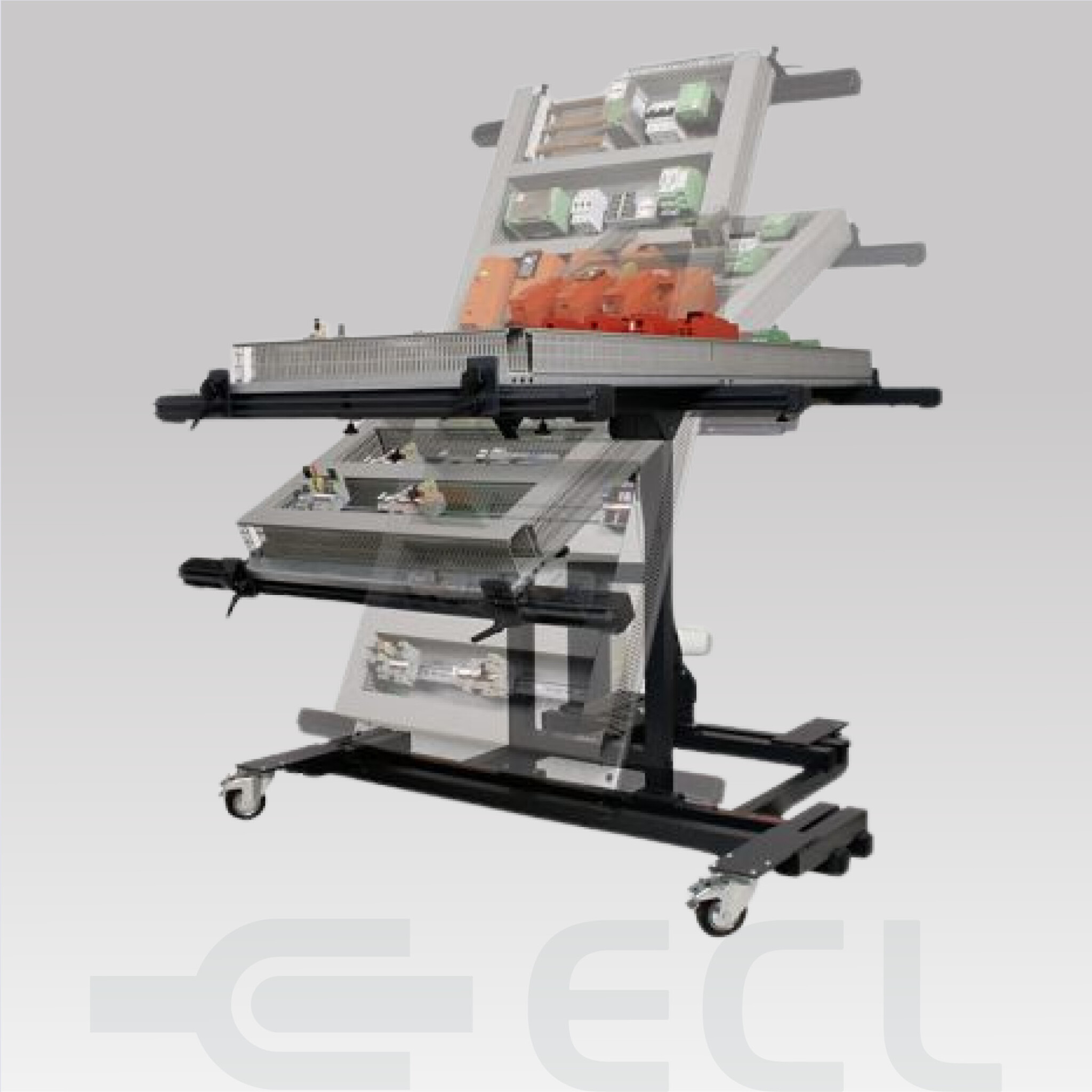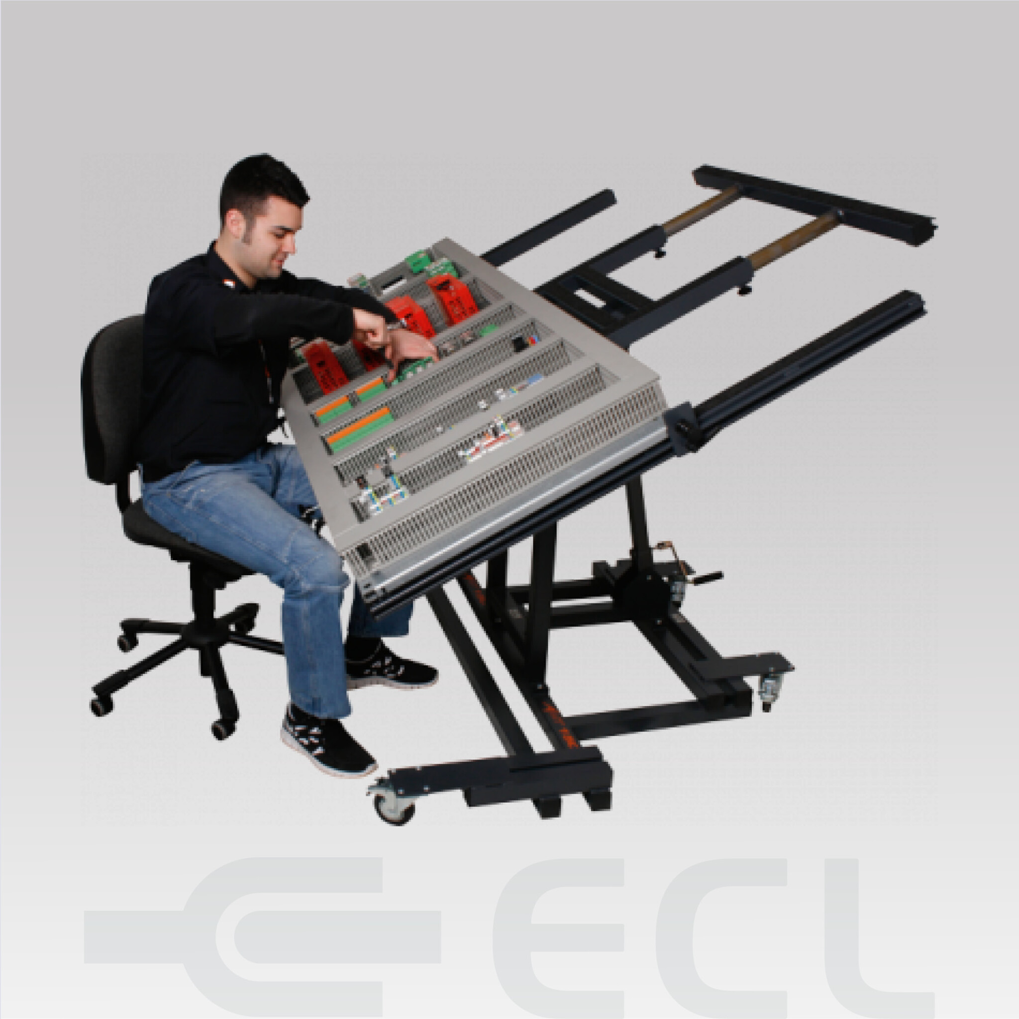 This table holds mounting plates with a surface area of up to 1,100 x 1,900 millimeters with a maximum load of 150kg. The mounting plate can be fixed by means of a clamping unit with quick-release fastener, which virtually eliminates the risk of the plate or the control cabinet housing slipping